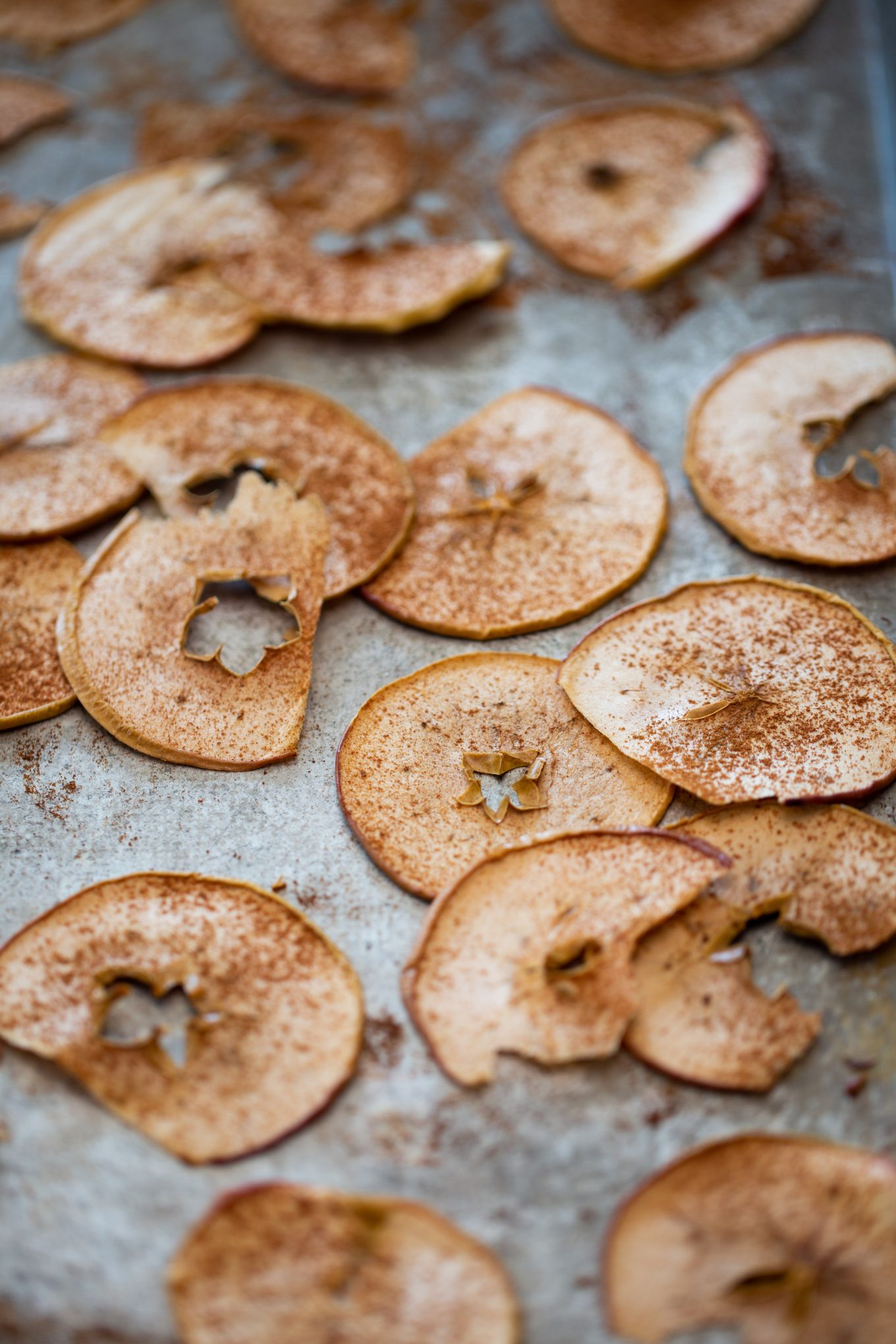 - Arrange slices in a single layer on the baking sheets and sprinkle lightly with cinnamon.