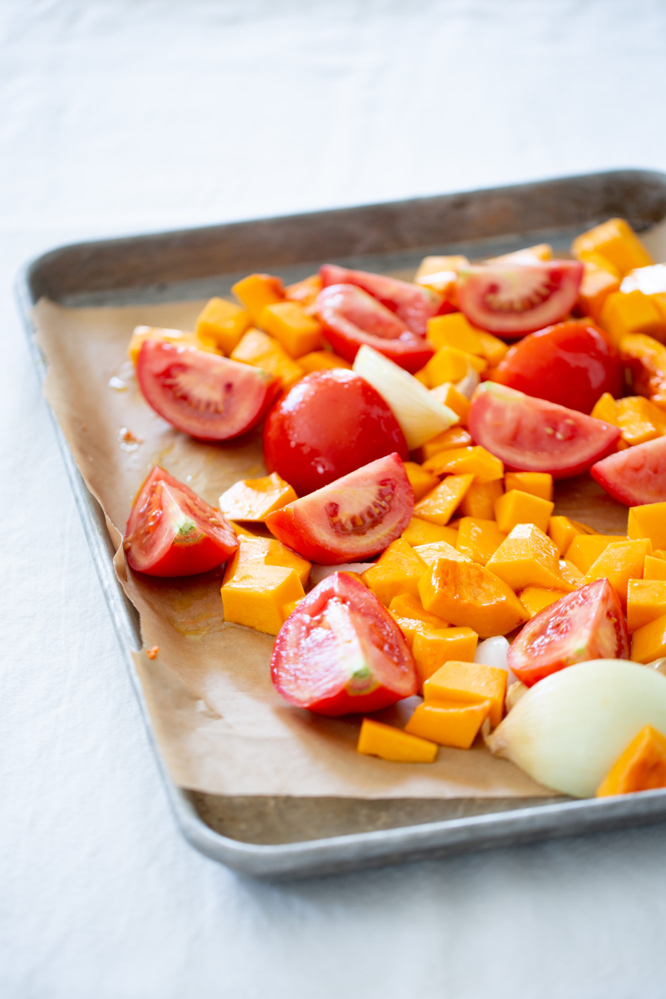 - Roast the vegetables. Toss squash, tomatoes, onion, and garlic with olive oil and salt. Roast at 400ºF for 25 minutes, until tender and caramelized. Hide the garlic under the squash so it doesn’t burn.