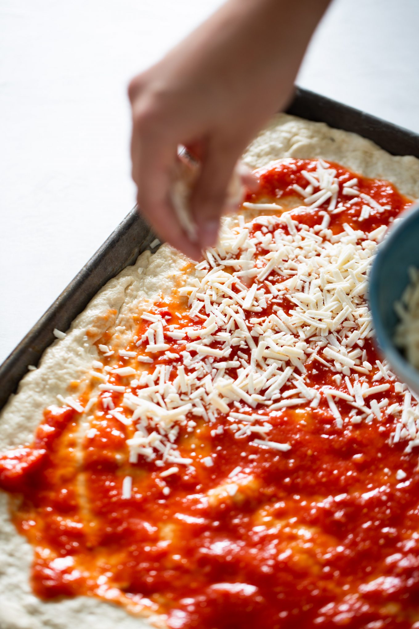 Sauce. Here, you can use the tomato sauce that you like the most. It can be homemade, store-bought, or made from canned tomatoes. I like my sheet-pan pizza the most when I make the sauce from canned San Marzano tomatoes.