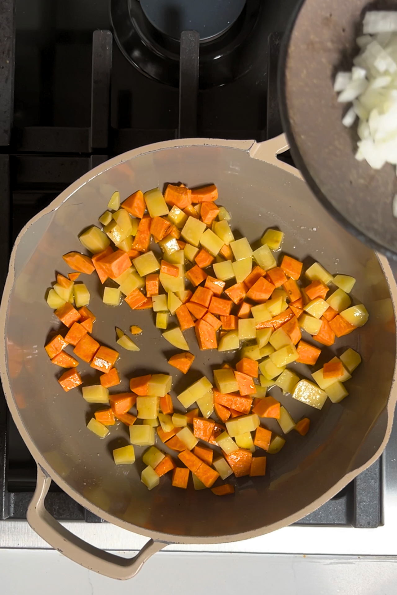 - Preheat a skillet and add the oil, potatoes, and diced sweet potatoes with a pinch of salt. Leave them uncovered for about 5-10 minutes until you see them begin to brown.
