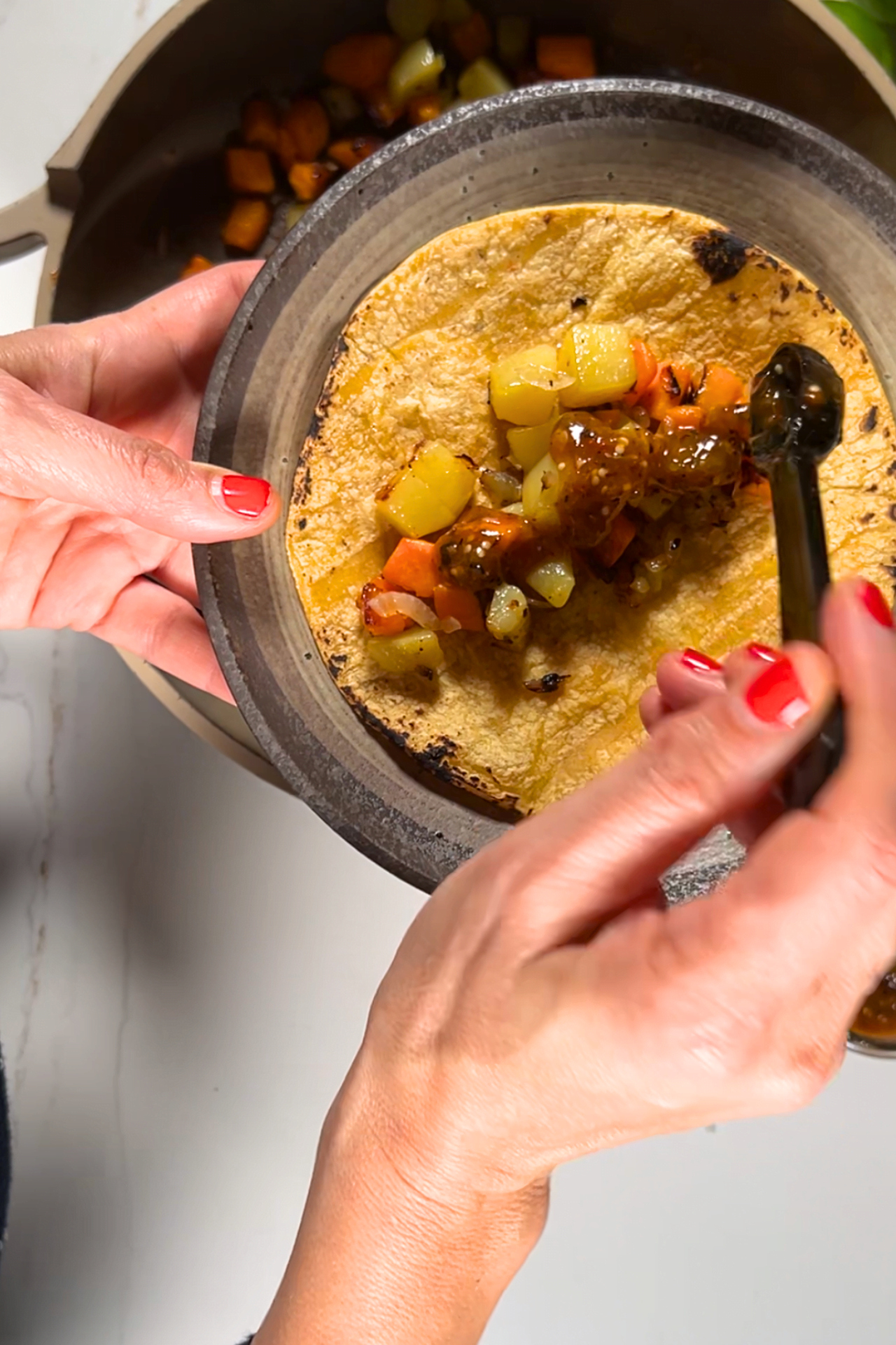 - Assemble tacos: Fill each tortilla with the potato-sweet potato mixture. Top with salsa and your favorite garnishes.