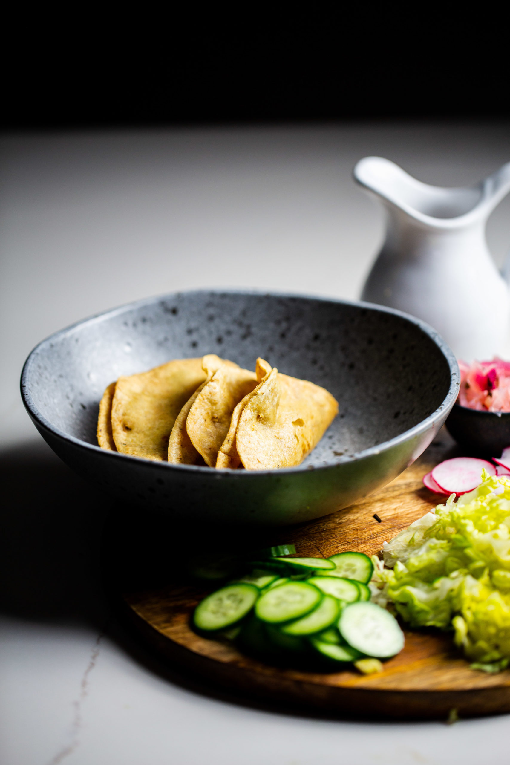 And yes, these tacos are fried, but the dish has some balance. 😉 These crunchy corn tortillas are filled with potatoes and served with lettuce, cucumber, radish, and onion (practically a salad), and at the end, they are bathed in a tomato broth and fresh herbs.