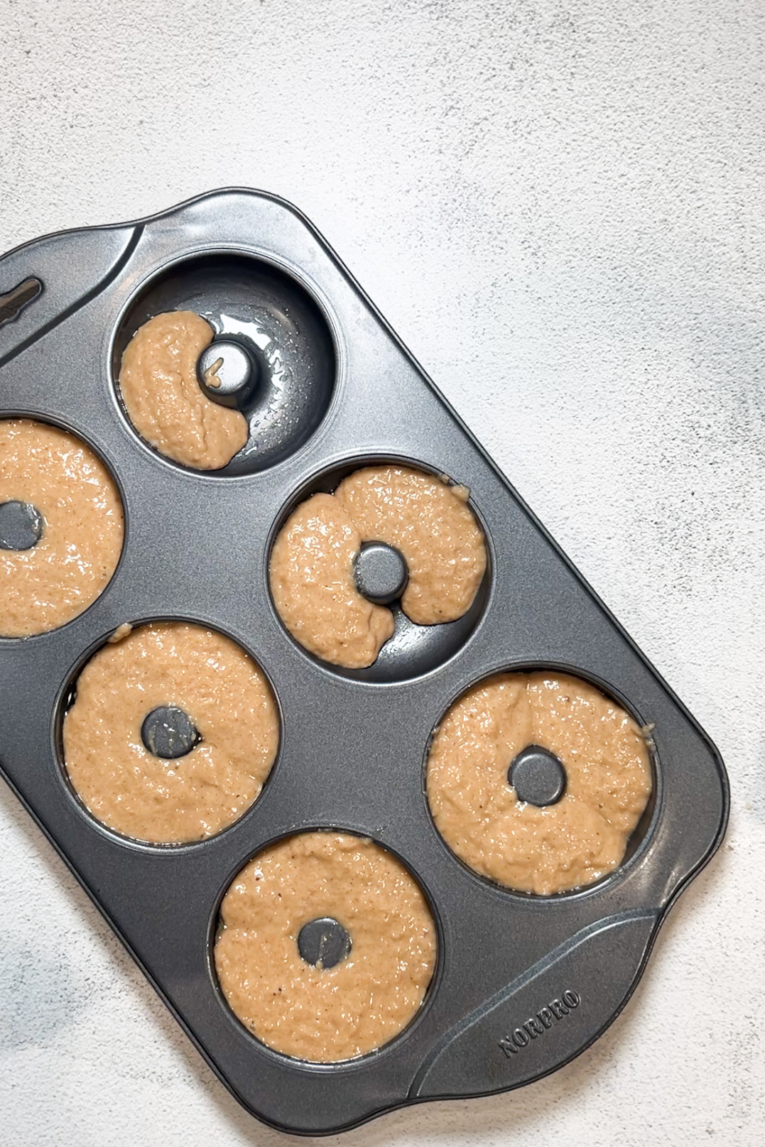 - Step 5 – Fill pan: Spoon or pipe batter into the greased donut pan, filling each mold about 2/3 full.