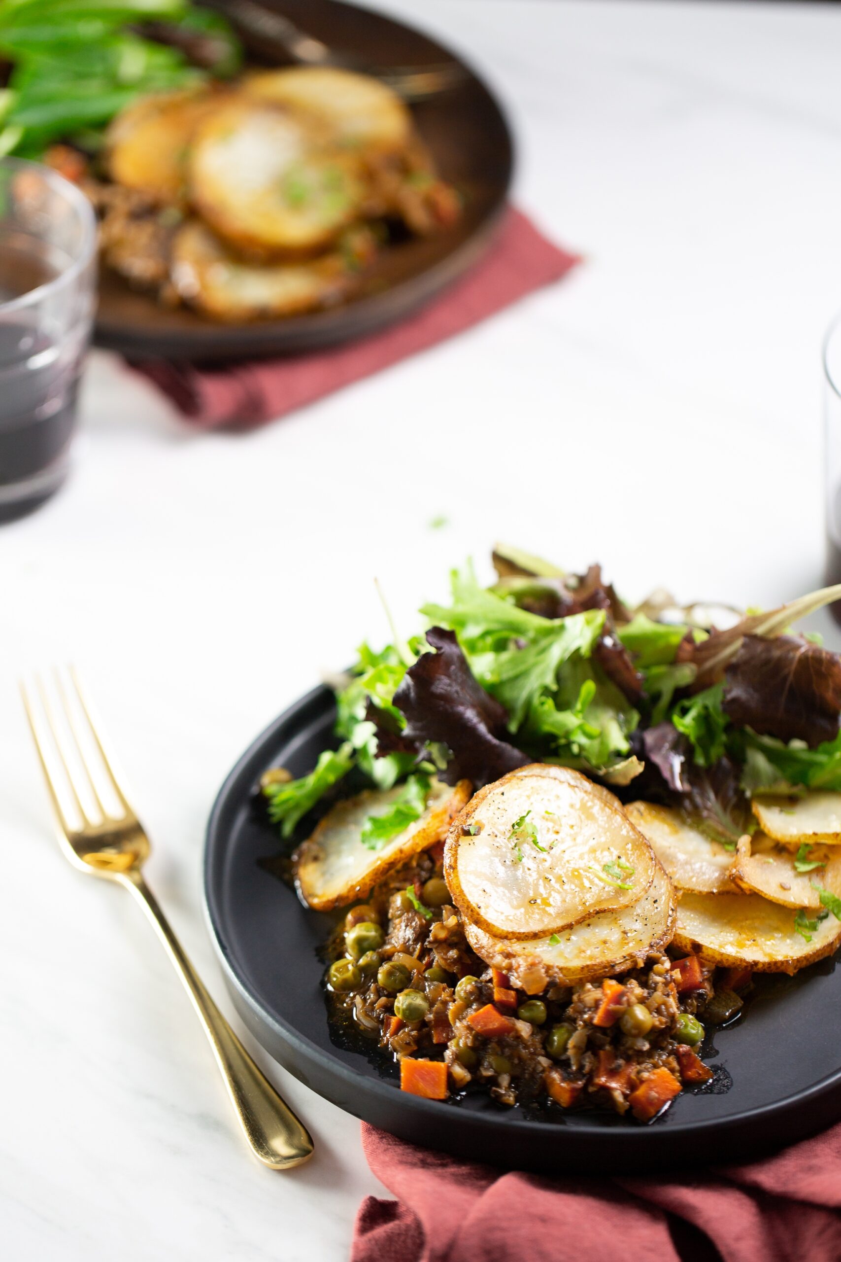 I hope this Vegan Shepherd’s Pie recipe becomes one of your favorites for winter days. The classic version is made with meat and mashed potatoes on top. This is the vegan version and with sliced potatoes on top.